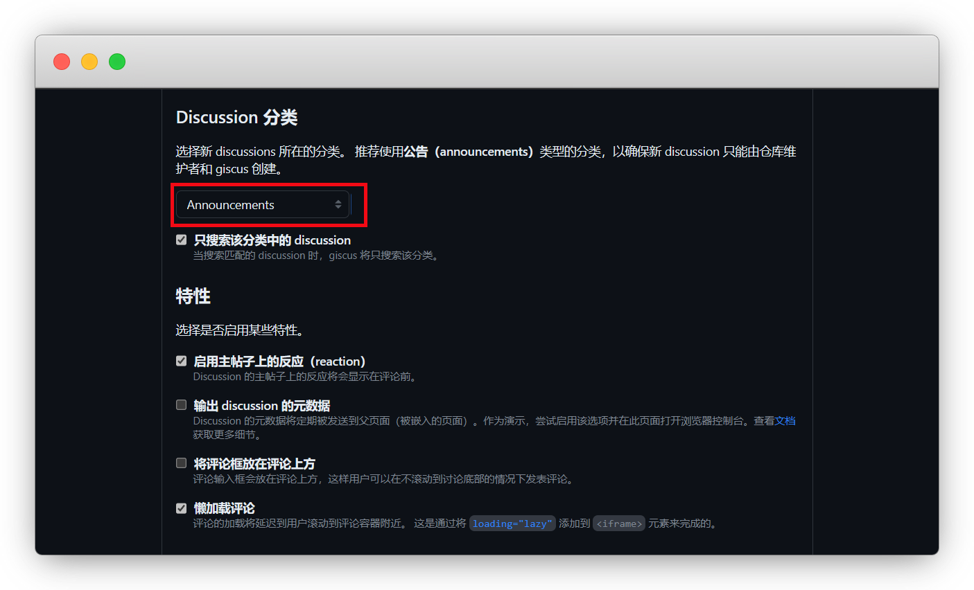 下拉到 Discussion 分类我们按推荐的选 Announcements ,懒加载评论也可以勾选下